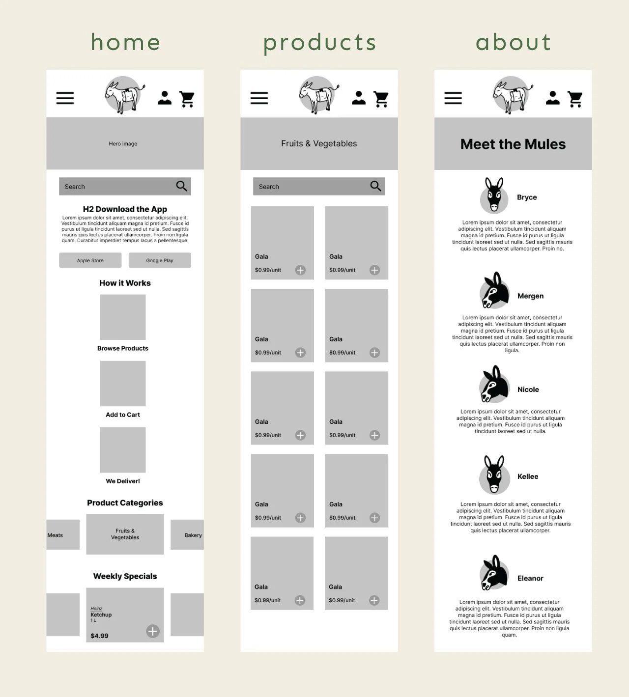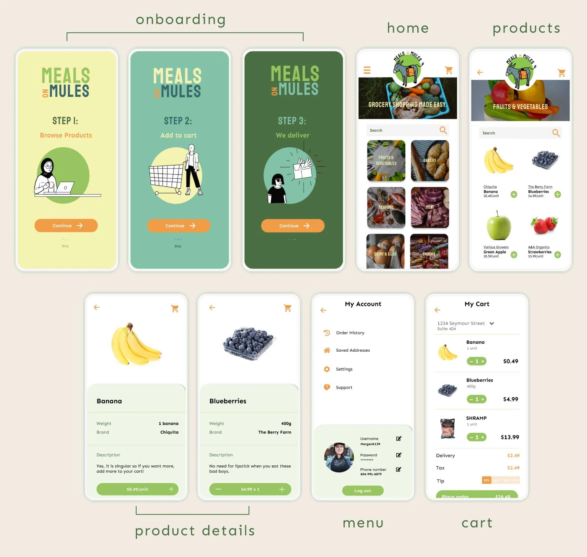 As part of a group project at BCIT, I contributed to the development of Meals on Mules, a grocery delivery mobile app and website. Our team included two designers and three front-end and back-end developers.