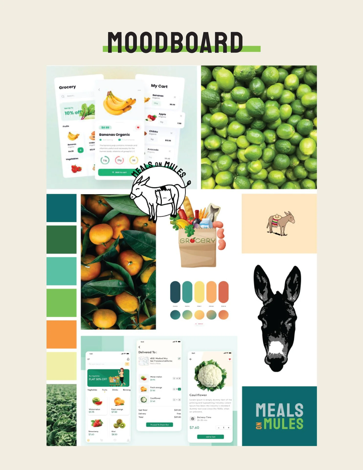 Next, the design team focussed on crafting the brand’s visual identity. We selected playful colours and typography to capture the vibrant energy of citrus fruits commonly found in grocery stores. The mule was incorporated into the logo as a symbol of strength and reliability, reflecting its historical role in carrying heavy loads—much like a modern grocery delivery service.